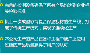 公司是一家瞄準國際、國內市場,集科、工、貿于一體的綜合性公司,擁有各類先進的設備100余臺(套),公司自主研發了新型保溫材料及彩鋼復合保溫板材連續生產工藝,建成了機上一次成型彩鋼復合保溫板材的生產線...